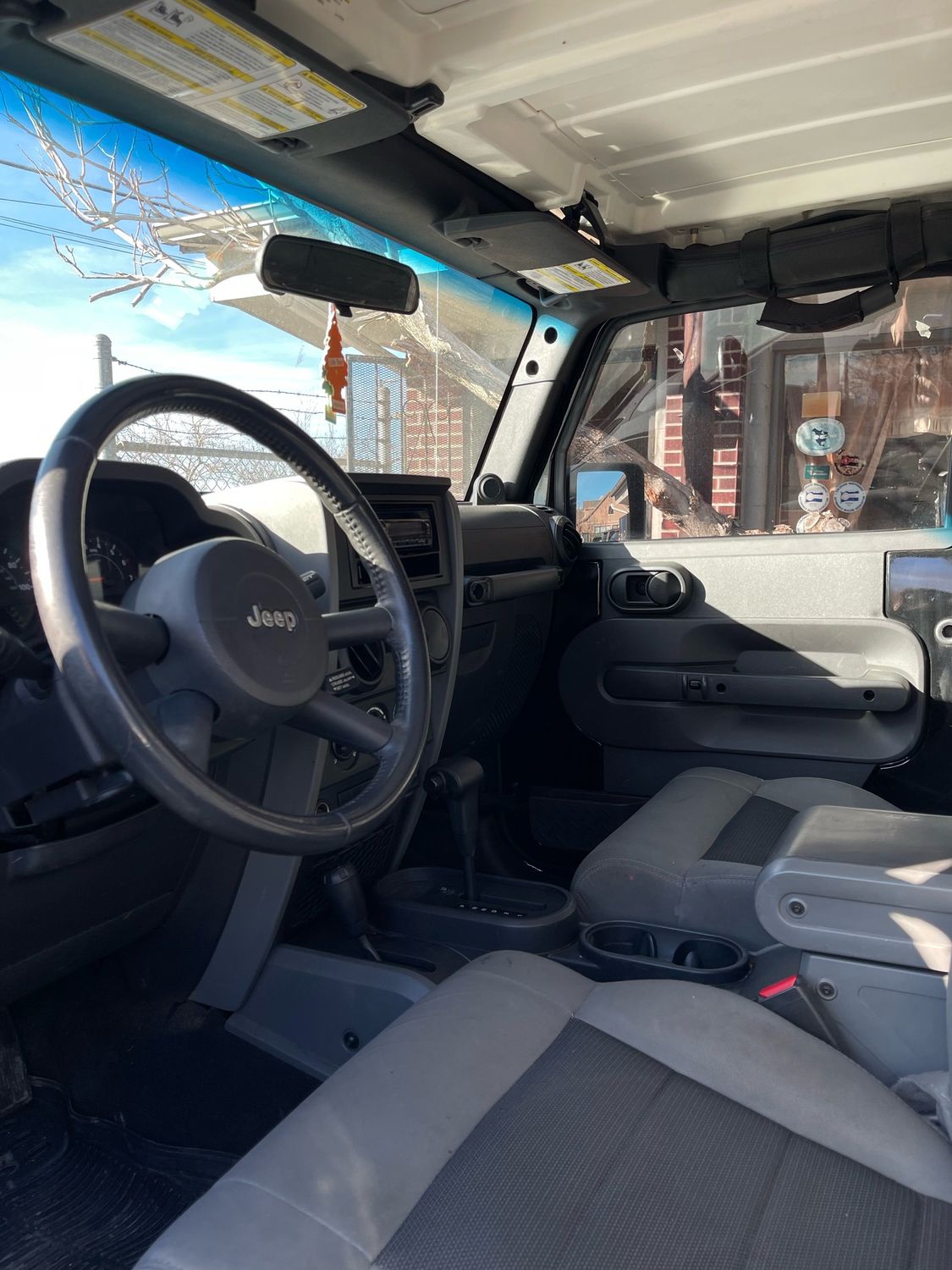 Finished in Black Clear Coat with a dark slate gray cloth interior, this two-door Wrangler features Command-Trac shift-on-the-fly 4WD, 17” aluminum wheels, all-terrain tires, and a 3-piece Freedom Top hard top. Inside, you’ll find air conditioning, power windows and locks, leather-wrapped steering wheel, rear folding seat, and an AM/FM CD MP3 audio system.